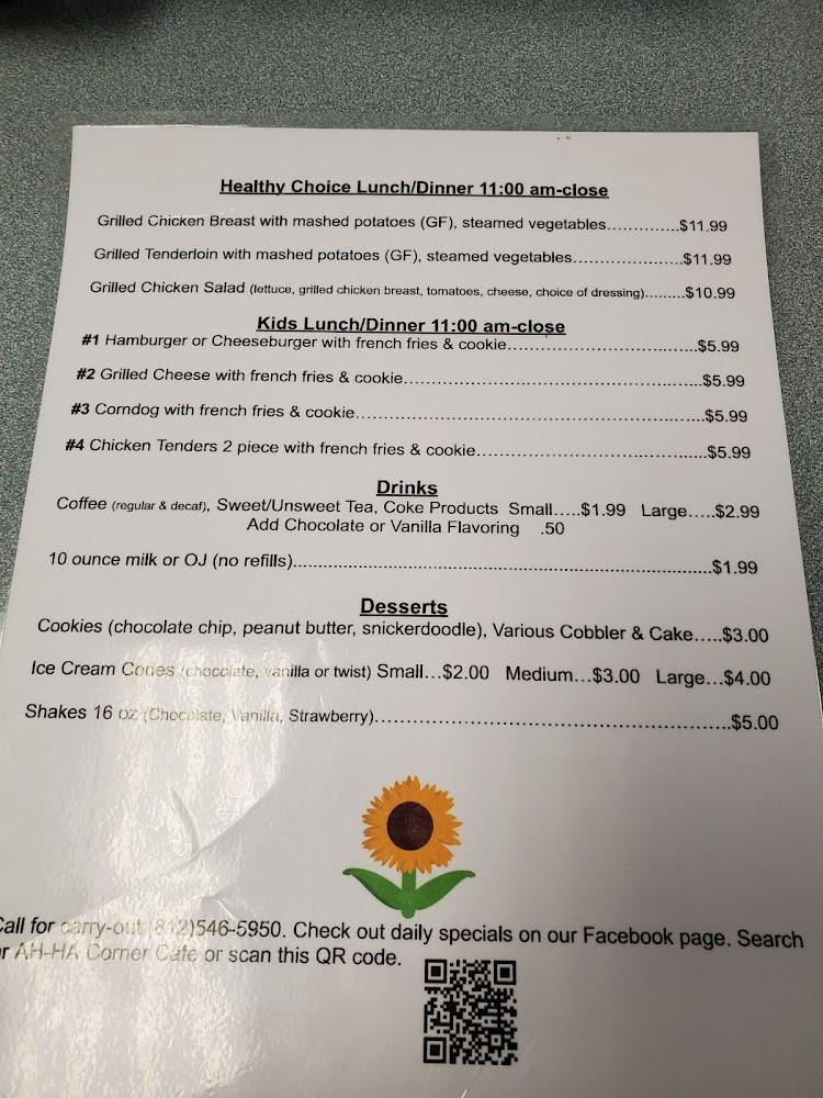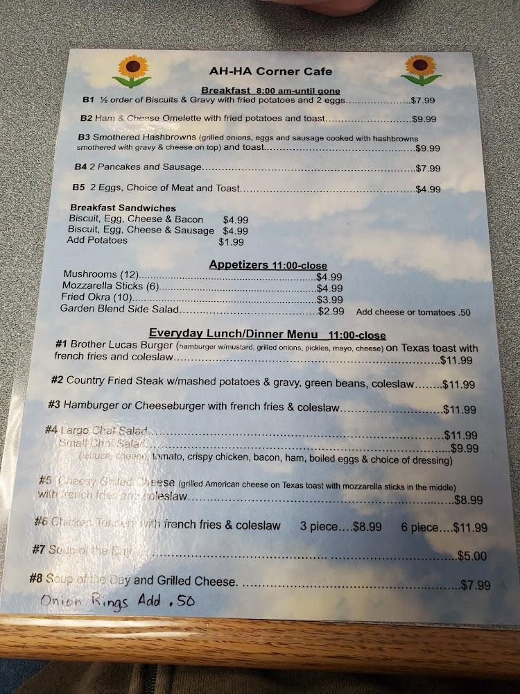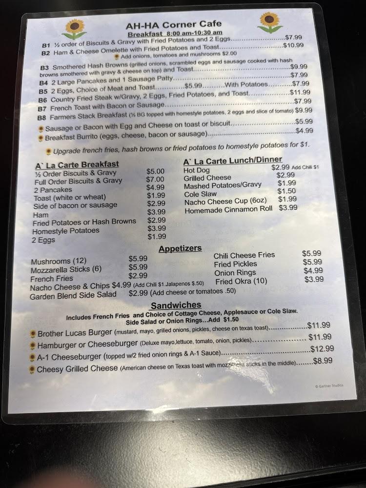 The menu at AH-HA Corner Cafe is packed with traditional favorites. Breakfast shines, offering options like biscuits and gravy, ham and cheese omelets, and towering pancakes. Priced reasonably, these items make dining accessible to all.
